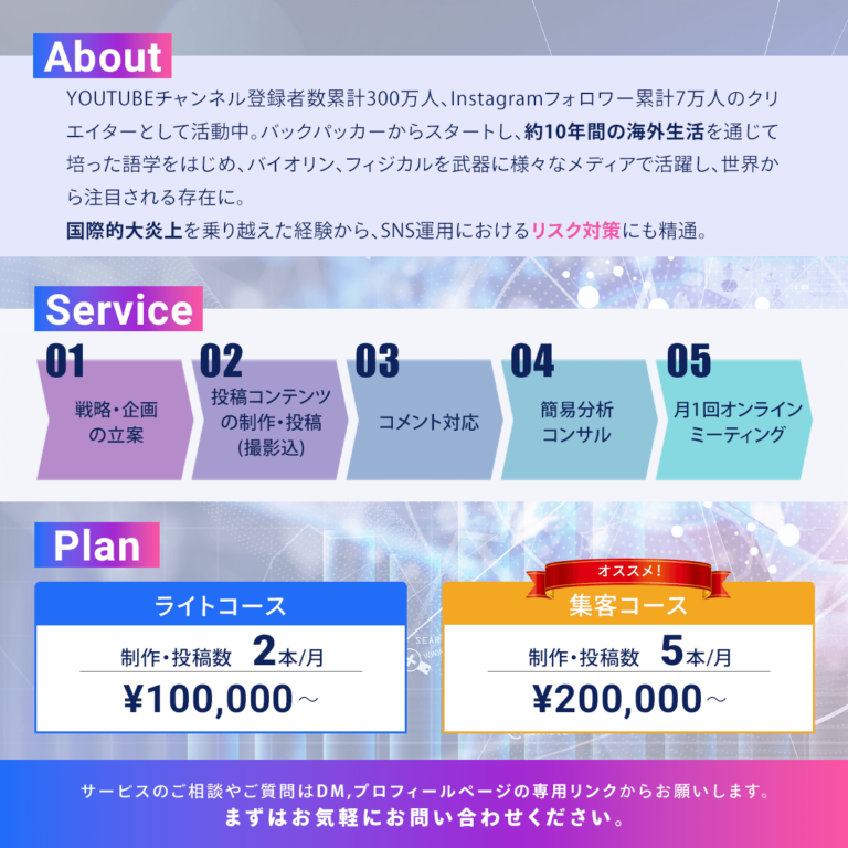・予算内で最低限の情報を入れられるよう、2枚の画像構成で自己紹介、サービス内容、料金目安の掲載を提案。